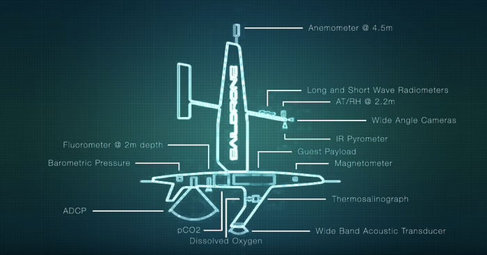 More than 20 sensors provide real-time air, water, and surface measurements, including precise positioning, optical imaging, dissolved oxygen, carbon dioxide, methane, salinity, fluorescence, water temperature, ocean surface temperature, ocean surface current, dissolved organic matter, magnetic field, barometer, air humidity, air temperature, wind, sonar/acoustic system for examining fish biomass and bathymetry, and others. The entire sensor package is solar-powered, and can operate non-stop for more than six months at sea.
